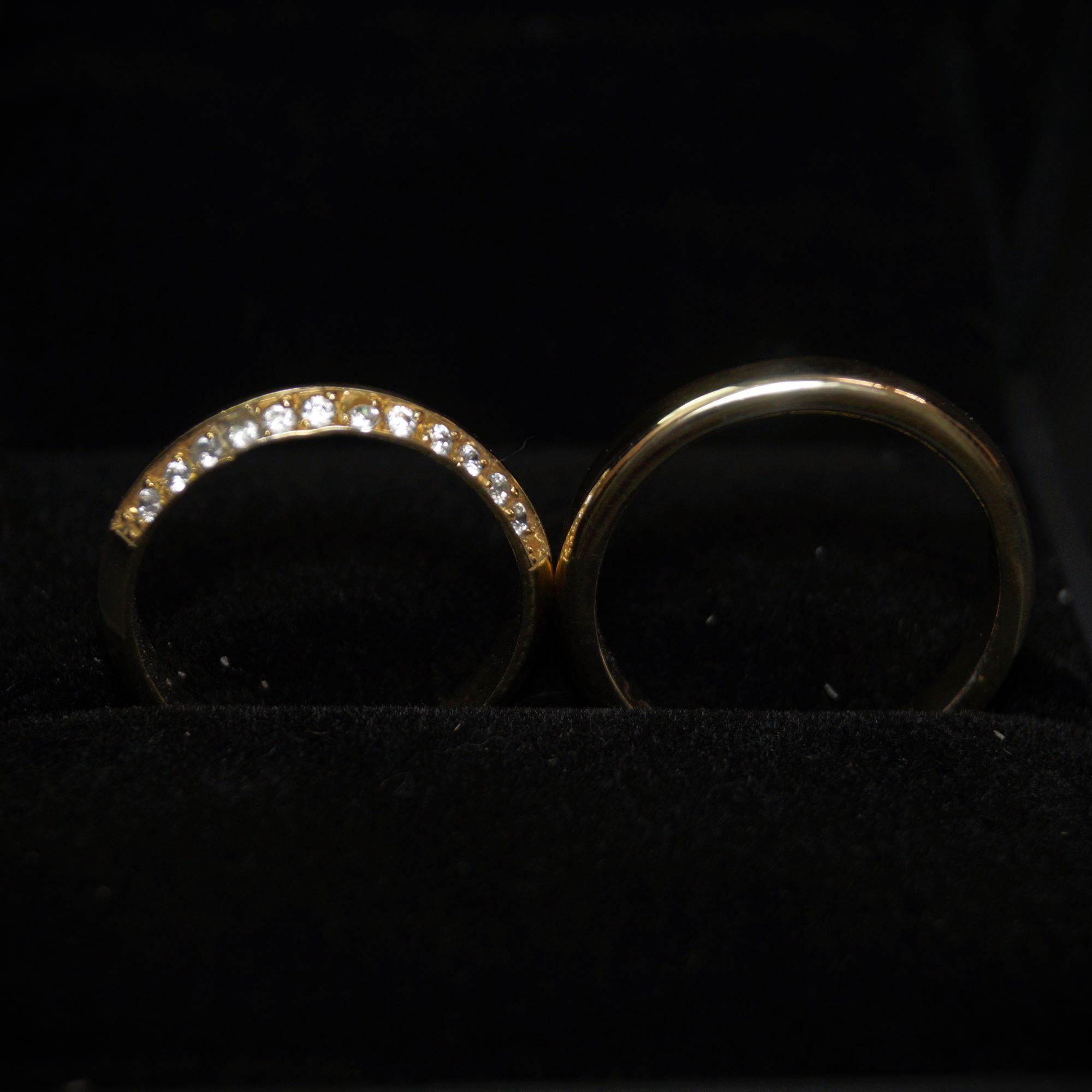 Un par que simboliza equilibrio: una argolla clásica, sobria y firme, junto a una pieza en cintillo con 12 diamantes que recorren su superficie como promesas hechas luz.