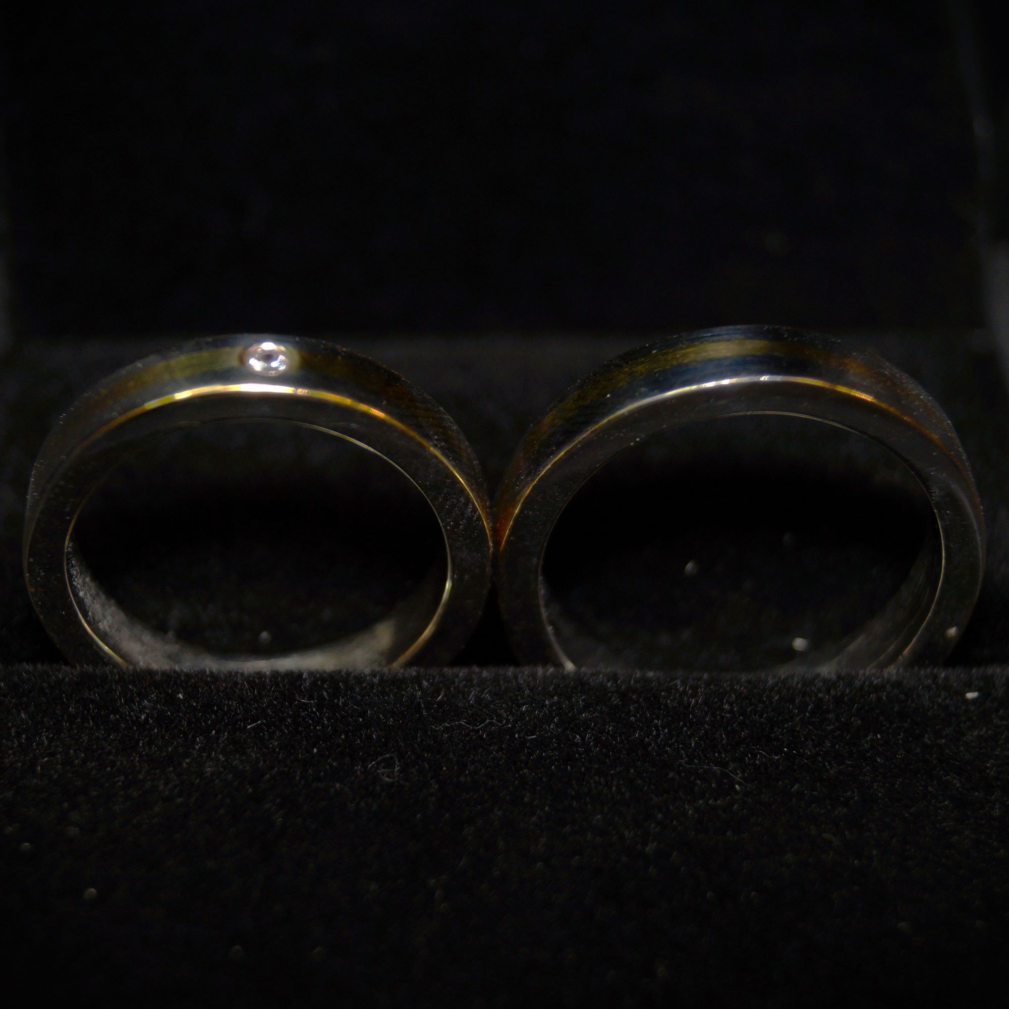 Una de las piezas lleva un diamante discreto, reflejo de la luz que nace cuando el vínculo es verdadero.